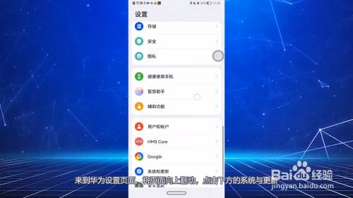 来到华为设置页面,将页面向上翻动,点击下方的系统与更新。