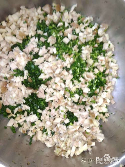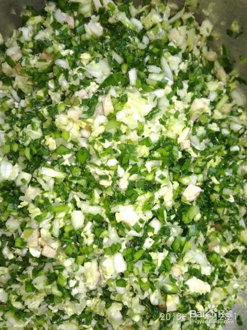 白菜洗净切碎,与韭菜、肉放在一起,加入盐、味精搅拌均匀