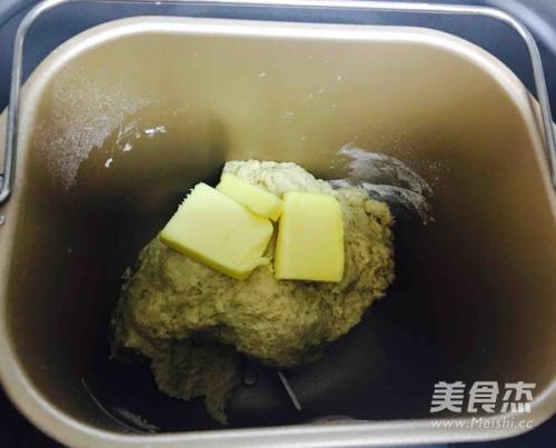 3启动和面程序10分钟后,放入室温软化的黄油,继续和面15分钟,可将黄油切更小片一点,便与搅拌。