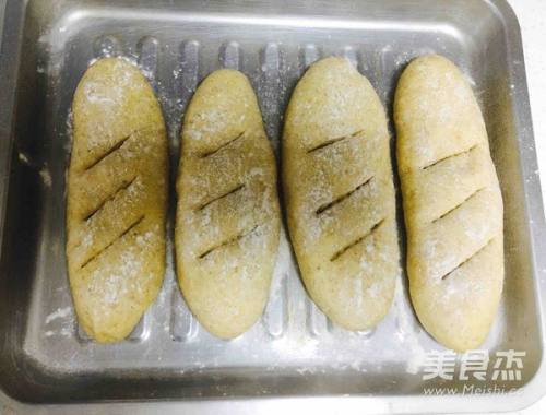 11二发约莫五十分钟,面包发酵至之前的一倍大。取出烤盘,均匀的筛上面粉,并用刀划出自己喜欢的形状。