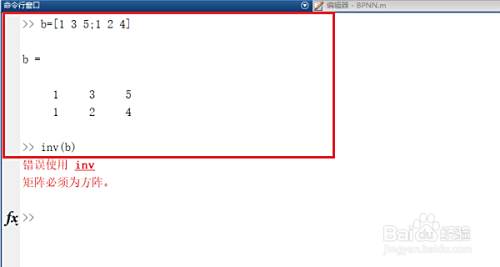 第三步使用inv(a)函数求矩阵的逆需要注意的是,a必须是方矩阵,也就是需要行列数相等的矩阵才可以,如下图所示:
