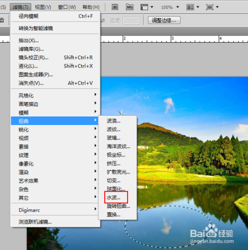 不要取消选区,点击“滤镜”-“扭曲”-“水波”。