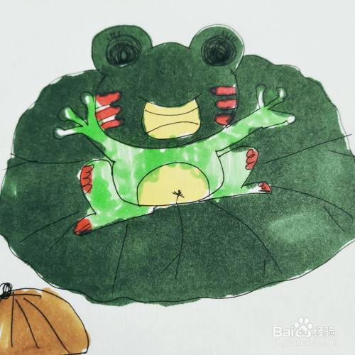第七步,我们来画卡通青蛙的颜色,拿出画笔随意描绘吧。