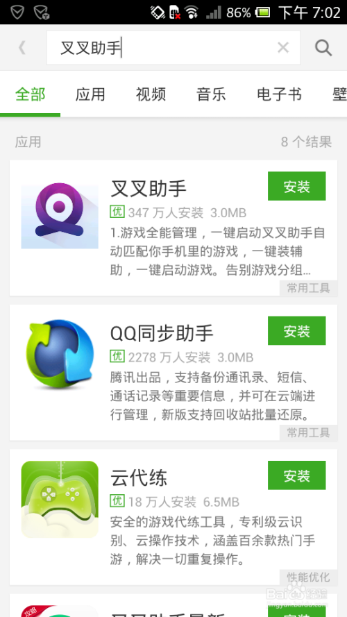 图1为安卓手机豌豆荚搜索叉叉助手页面,点击安装即可。