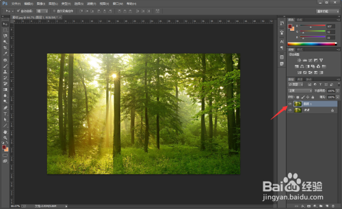 找好素材之后,我们首先将春天森林的素材投入到PS操作区域中,并复制出背景图层,如下图所示。