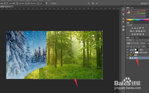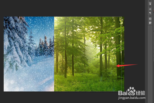 接着我们调整,第2个图片素材,冬天雪地素材的轮廓,让其轮廓与春天森林素材的轮廓相一致,这样方便我们后续操作,如下图所示。