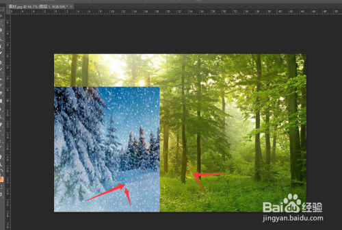 接着我们将第2张雪地森林的图片素材投入到PS操作区域中,然后将其上下对齐即可,如下图所示。