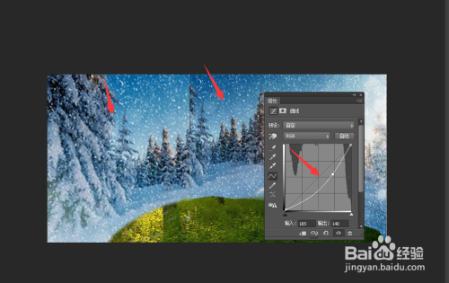 然后我们再拖入一个雪地背景图层,然后使用图层蒙版工具,将轮廓线之上的全部变成锁雪地的背景图层。然后我们再使用曲线工具将其亮度与之前的调整一致即可,如下图所示。