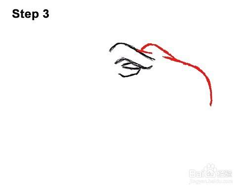 第3步:在头部另一侧的右侧额外画一条倾斜线。头部另一侧的眼睛将不可见,只有厚厚的额头。在眉毛的右侧,绘制一条向下弯曲的线,该线对于霸王龙枪口的顶部部分向下弯曲。
