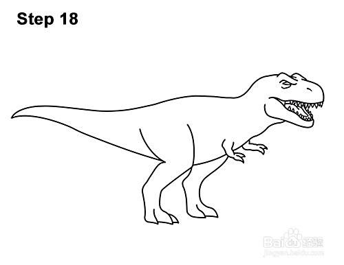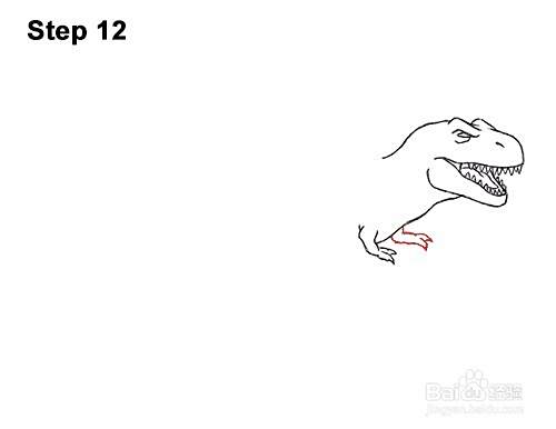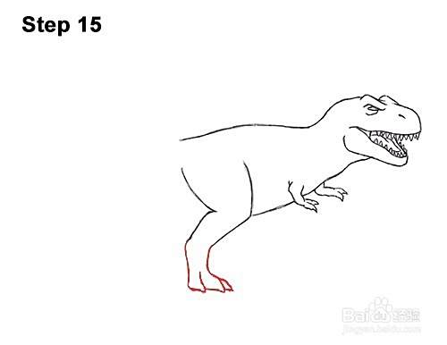 第15步:在脚的下方为脚的顶部画两条短垂直线。在底部绘制霸王龙的脚趾。脚趾在形状上与大于号(>)相似。第三只脚趾几乎不可见,因为它在另一侧。