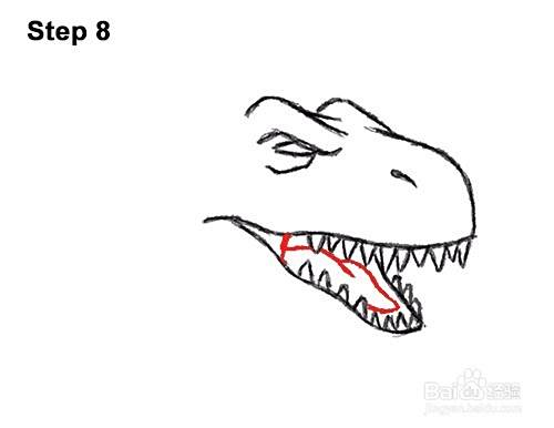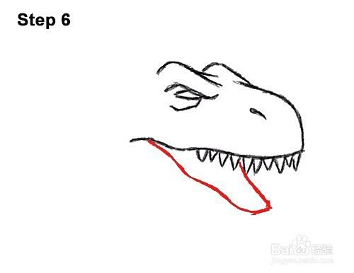 第6步:在恐龙开口的下边缘画一条长长的曲线。这条线的形状应该类似于波浪形的倾斜字母V.