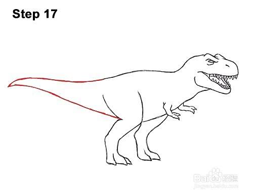 第17步:继续绘制背面朝左的线以创建尾部的顶部边缘。在尾部的底部边缘添加下面的另一行。尾巴应该在左边的一个点上。注意尾巴与恐龙身体的其他部分相关的时间。