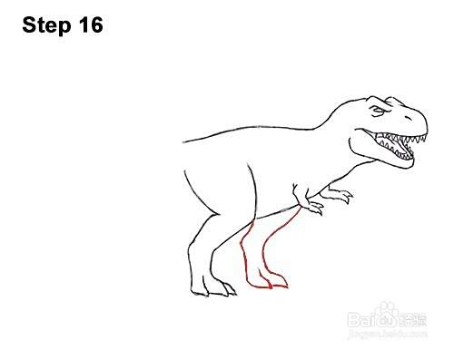 第十六步:用同样的方法画另一条后腿。顶部将不可见,因为它在身体后面。T. rex的腿应该在顶部厚而在底部逐渐变薄。从这个角度只能看到两个脚趾。