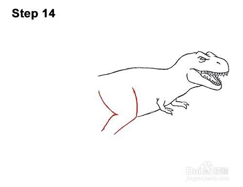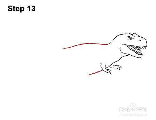 第13步:在顶部,为霸王龙的背部绘制一条长弯曲的水平线。在腹部的左侧,腹部绘制一条较短的弯曲水平线。