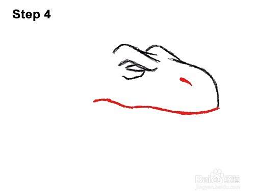 第4步:现在画出一条向左伸展的线,用于霸王龙嘴巴的顶部边缘。使线条有点波浪。它应该比眼睛向左延伸得更远。在顶部画一个小缝,右侧为鼻孔。