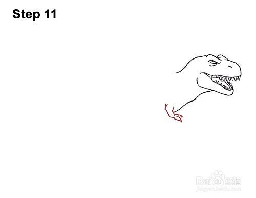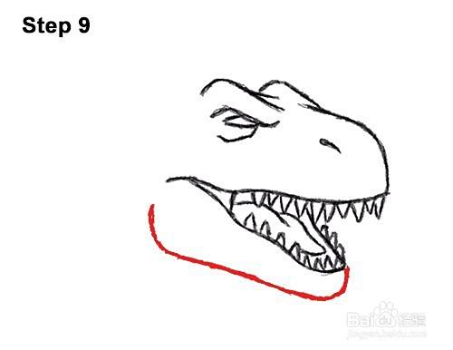 第9步:在嘴巴下方画一条向左弯曲的长线,用于下巴。该线应向嘴部弯曲以强调恐龙的下巴肌肉。