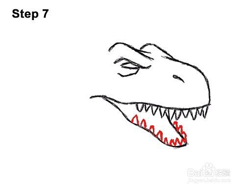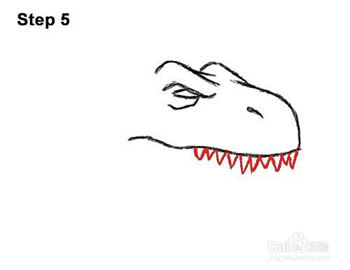 第5步:沿着牙齿的嘴部绘制一系列短V形线。T. rex的一排牙齿不应该从嘴巴的左边开始。他们应该从中间开始。