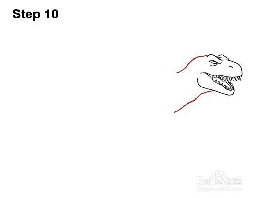 第10步:在霸王龙眼的左侧,画出头部后部和颈部顶部边缘的曲线。记得先要轻描淡写,当你的形状正确时,将线条变暗。在嘴下,画出一条向左倾斜的波浪线,用于颈部的下边缘。