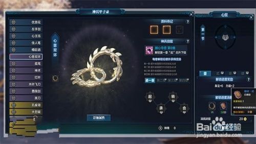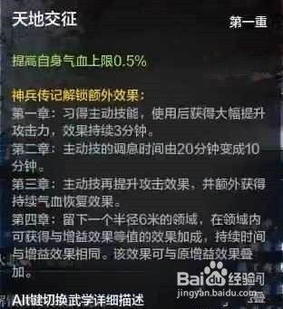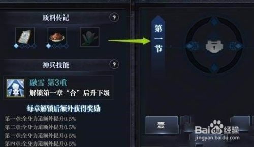 最后,每个神兵共分为四大章节,每个章节又分为四级:起,承,转,合;当四级全部解锁时才算解锁一大章节。