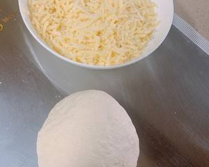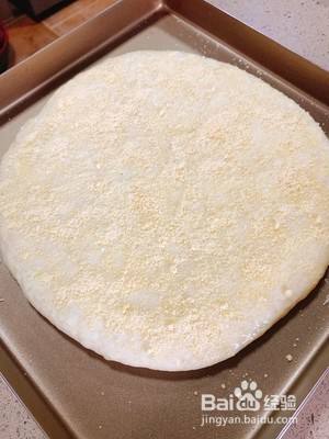 把面团擀开,加入马苏里拉和白砂糖、芝士粉的混合物