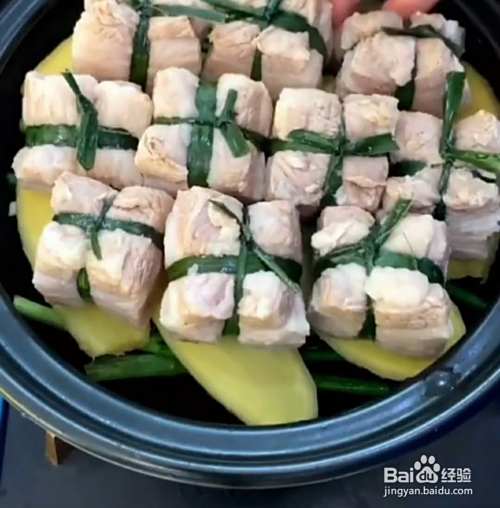 将肉放下锅,,铺葱,姜,五花肉皮朝下铺好。