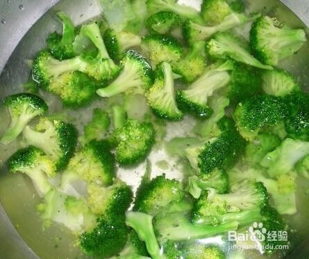 去掉西兰花表面的脏东西,然后将它掰成一小块一小块的,放进热水里焯一下,或者放在盐水里浸泡一会儿,捞出来待用。
