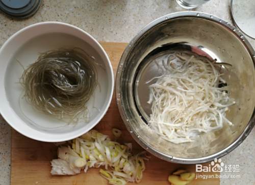 首先将红薯粉丝用温水泡软,金针菇切掉根部,清洗干净。