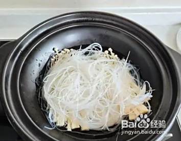 砂锅里铺上一层金针菇,再依次放入粉丝,基围虾和鱼丸。