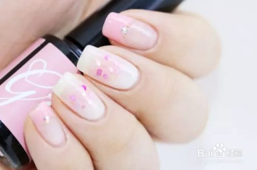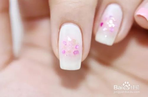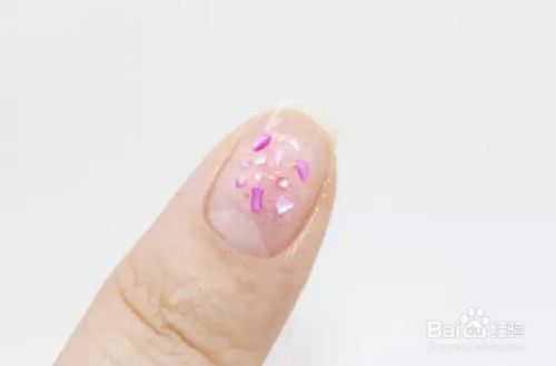 Step 3:在印上粉红色指甲油的区域撒上浅粉色、玫红色以及金色贝壳片。无名指重复步骤2-3.