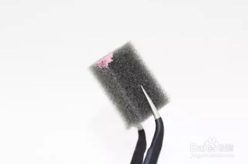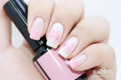 Step 1:中指和无名指上涂上一层奶白色指甲油,其他手指涂上透明指甲油。取一块小小的方形海绵,在海绵的一角粘上粉红色的指甲油。