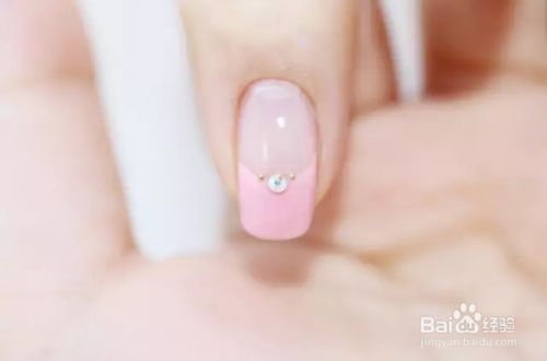 Step 5:食指和小拇指上用粉红色指甲油画一个“V”形的法式美甲,然后在“V”形的尖端贴上一颗透明水钻并在水钻两边各贴上一颗小小的金色铆钉。