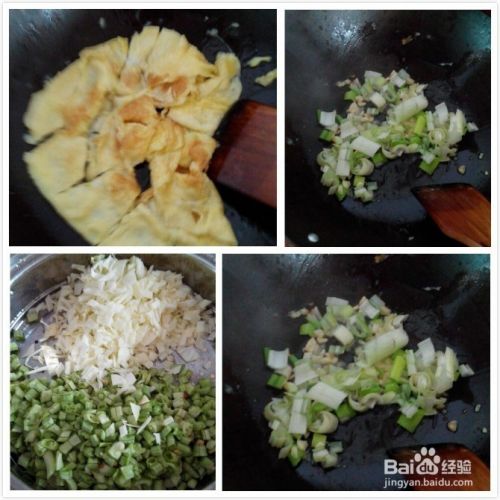 鸡蛋两个,打到碗里,放入少量面粉搅拌。热油煎蛋成两面金黄呈出待用。