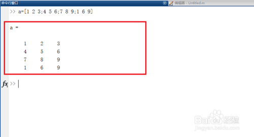 第一步打开matlab命令行窗口,新建一个a=[1 2 3;4 5 6;7 8 9;1 6 9]矩阵,如下图所示: