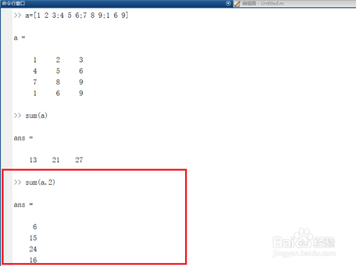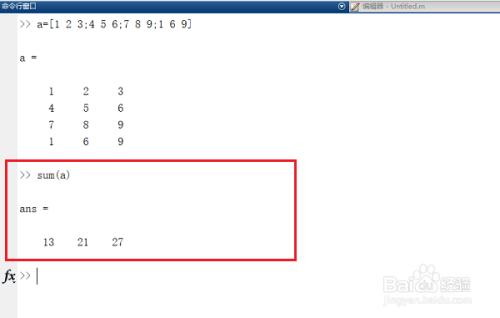 第二步我们通过sum(a)来求矩阵的各列之和,可以看到返回的是a矩阵每列和的值,如下图所示: