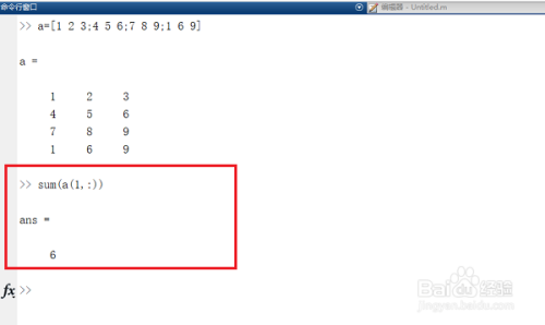 第六步如果我们想求矩阵某一行元素之和,可以通过sum(a(1,:))格式来求,这求的是a矩阵第一行之和,如下图所示: