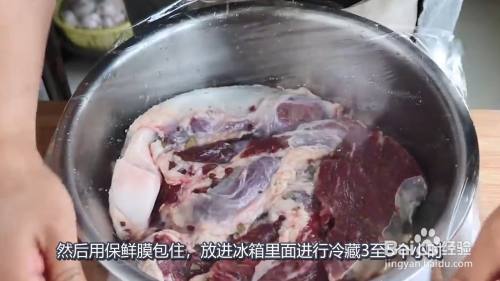 牛肉多清洗几遍,控干水分备用,用牙签在牛肉上面扎一些孔,把炒好的盐均匀涂抹在牛肉上,然后用保鲜膜包住,放进冰箱里面进行冷藏3至5个小时。