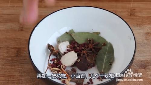 碗里放入一个拍破去籽的草果,再加入香叶、桂皮、八角、白芷、陈皮,再加一把花椒、小茴香、几个干辣椒,加入清水浸泡一下去除杂质。