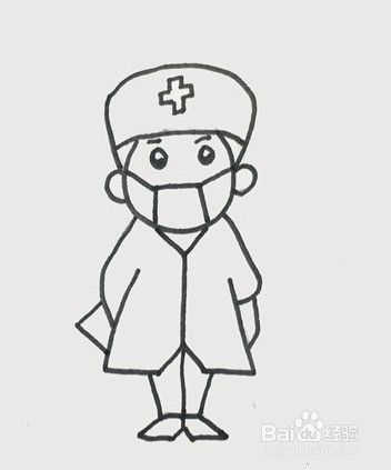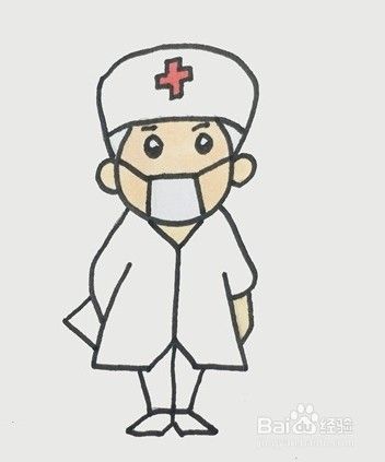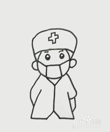 先画出医生的帽子,往下画出医生的头部,面部戴着口罩,接着画出身体,穿着白大褂,双手背在身后,再来画出腿和鞋子,最后给医生的面部和手涂上肤色,简单的医生就画好了。