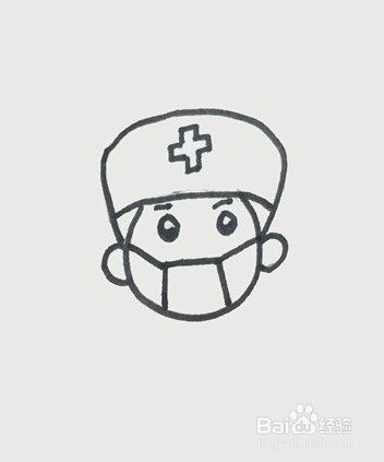 先画出医生的帽子在上面画出十字架,然后往下画出眼睛,接着画出脸,在脸上画出口罩,往旁边画出耳朵。医生的头部就画好了。
