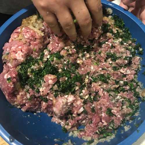 2猪肉糜 荠菜和香菇末加入调料 混合均匀 吃不准咸淡的话 可以尝尝咸淡