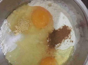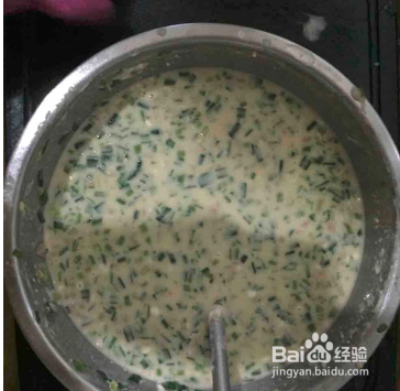 在小盆子中添加面粉(一般一碗半可以摊6-8个鸡蛋饼),加入鸡蛋2枚,盐少许,十三香少许,鸡精少许,加水和匀。注意的是先调的稍微稀一些,因为一会要加菜进去