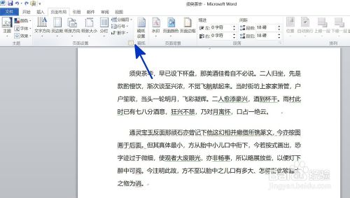 在打开的页面中,点击【页面布局】功能选项卡,然后在[页面设置]项目中点击下图中蓝色箭头指向的小按钮。