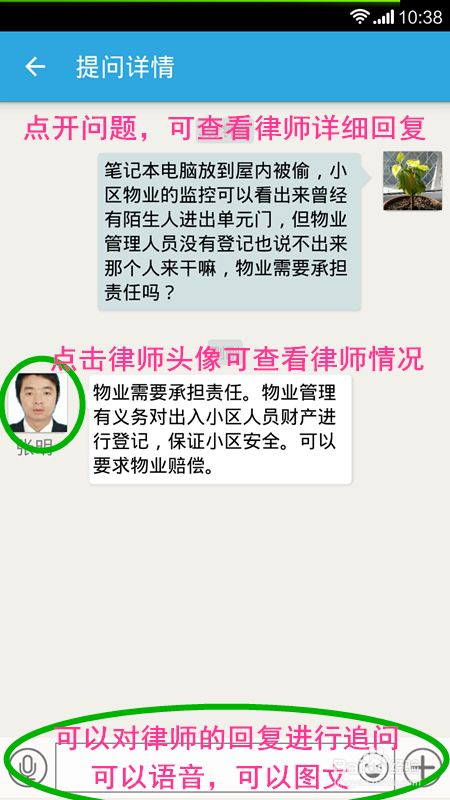 律师回复后,我们会收到提醒,类似于微信新消息,点开可查看详情