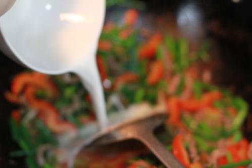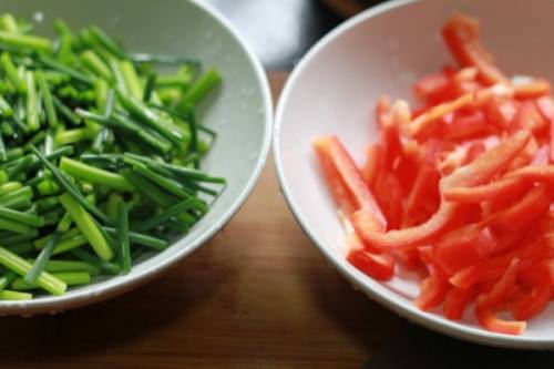 6放入甜椒和韭苔,再放盐。翻炒2分钟左右,准备好水淀粉。待锅中菜斗熟的差不多,放鸡精,然后就倒入水淀粉,大火翻炒收汁,让菜上面挂汁
