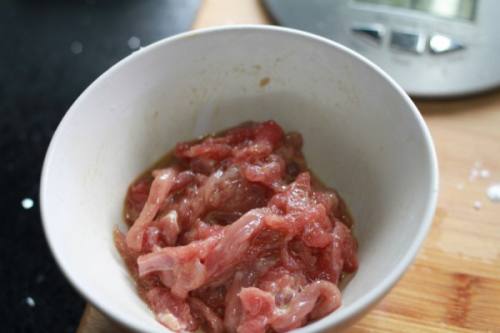 4肉切丝后,拌入一勺淀粉和2勺生抽,拌匀。