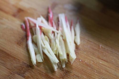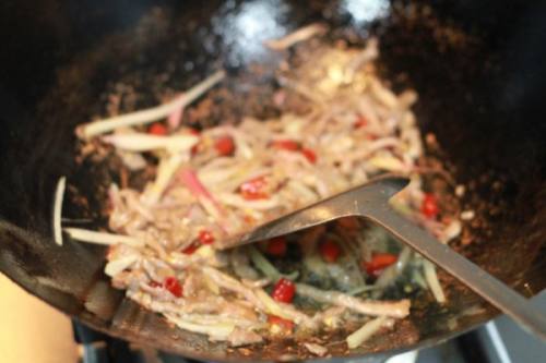 5锅中倒油,油热后,放入泡椒和花椒爆香,然后放入肉丝,翻炒到肉丝变色,再放入子姜丝。炒1分多钟