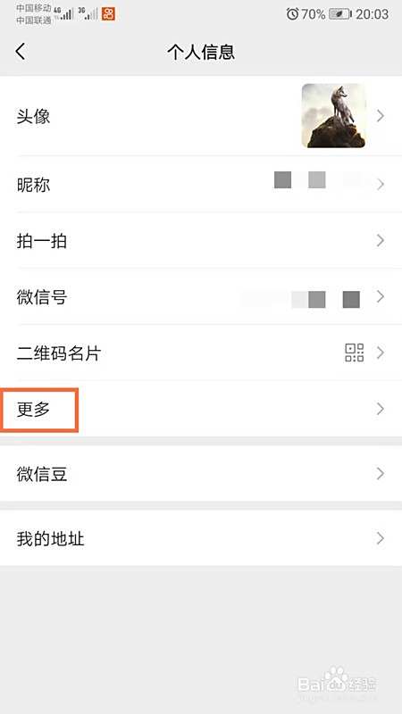 2、点击自己的头像进入个人信息,选择【更多】;