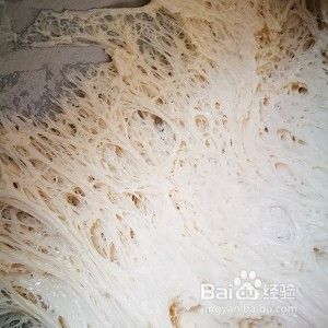盖上保鲜膜发酵至两倍大,用手指蘸干粉,在面团中间戳一个洞,面团不回缩。拉开面团,内部有蜂窝状组织。