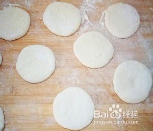 掌心稍稍压扁,撒一些干粉,擀成大约一厘米厚的薄饼。