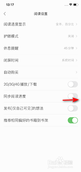 之后将同步阅读进度的滑动按钮向右滑动,滑动完成后就开启了同步阅读进度。